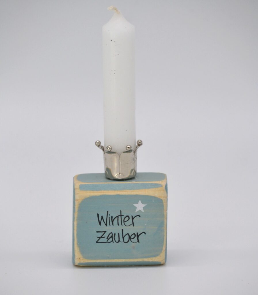 Kerzenhalter Winterzauber aus Holz mit Krone in hellblau Material: Holz mit Metallhalterung für Stabkerzem Mit Liebe in Handarbeit hergestellt Größe: H6 B6 T4cm