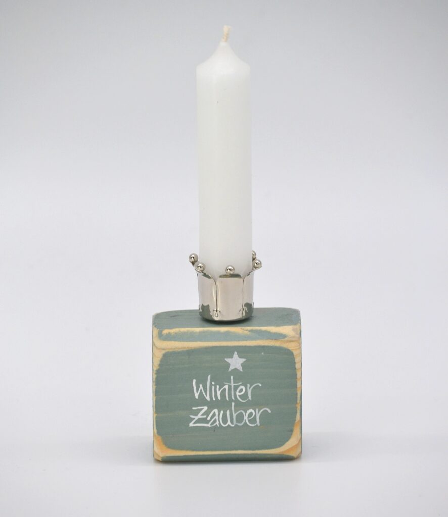 Kerzenhalter Winterzauber aus Holz mit Krone in lindgrün/weiß Material: Holz mit Metallhalterung für Stabkerzem Mit Liebe in Handarbeit hergestellt Größe: H6 B6 T4cm
