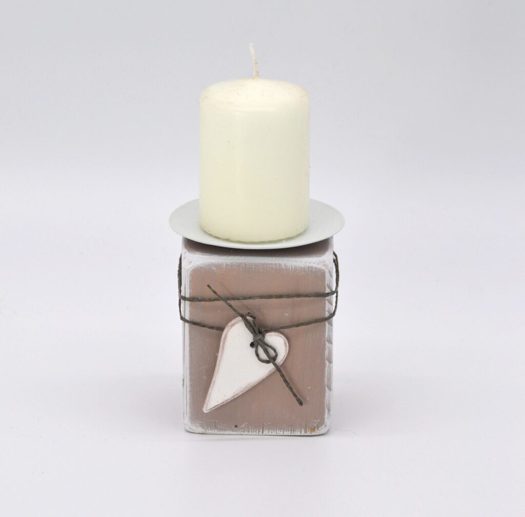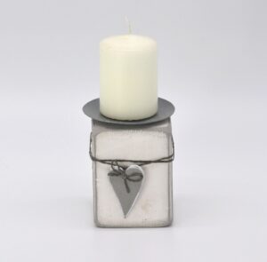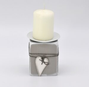 Kerzenhalter aus Holz mit Herz in grau/weiß Material: Holz mit Metallhalterung für Stumpenkerzen Mit Liebe in Handarbeit hergestellt Größe: H11 B7,5 T7,5cm