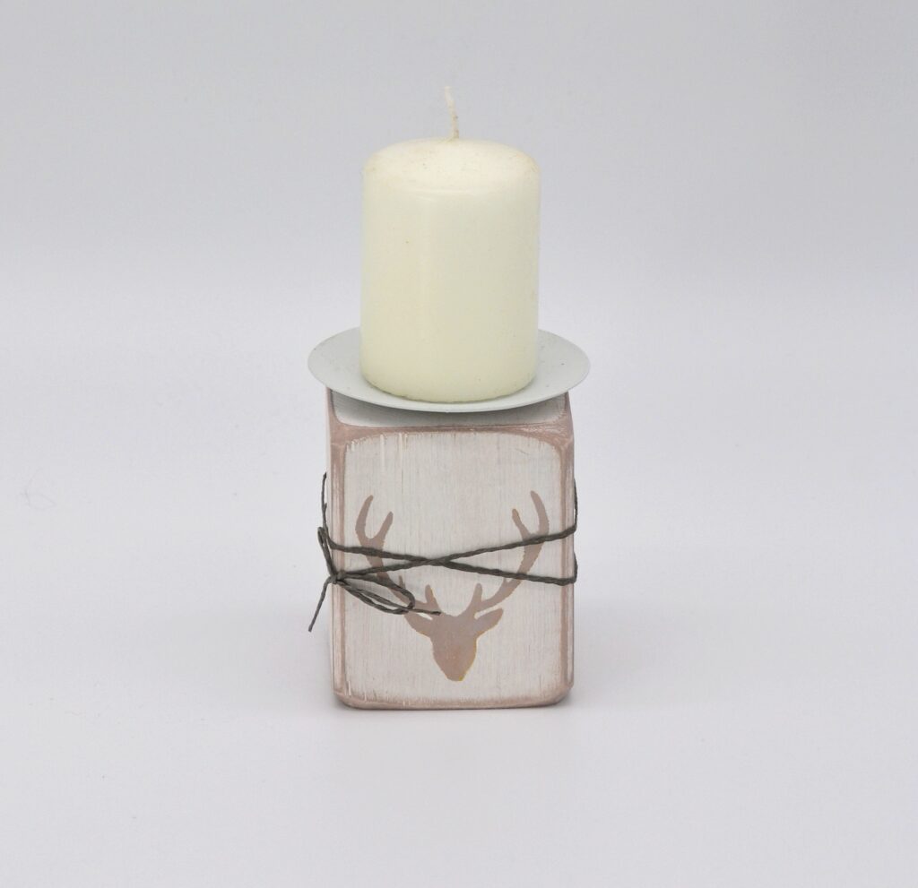 Kerzenhalter aus Holz/Hirsch in altrosa/weiß Material: Holz mit Metallhalterung für Stumpenkerzen Mit Liebe in Handarbeit hergestellt Größe: H11 B7,5 T7,5cm
