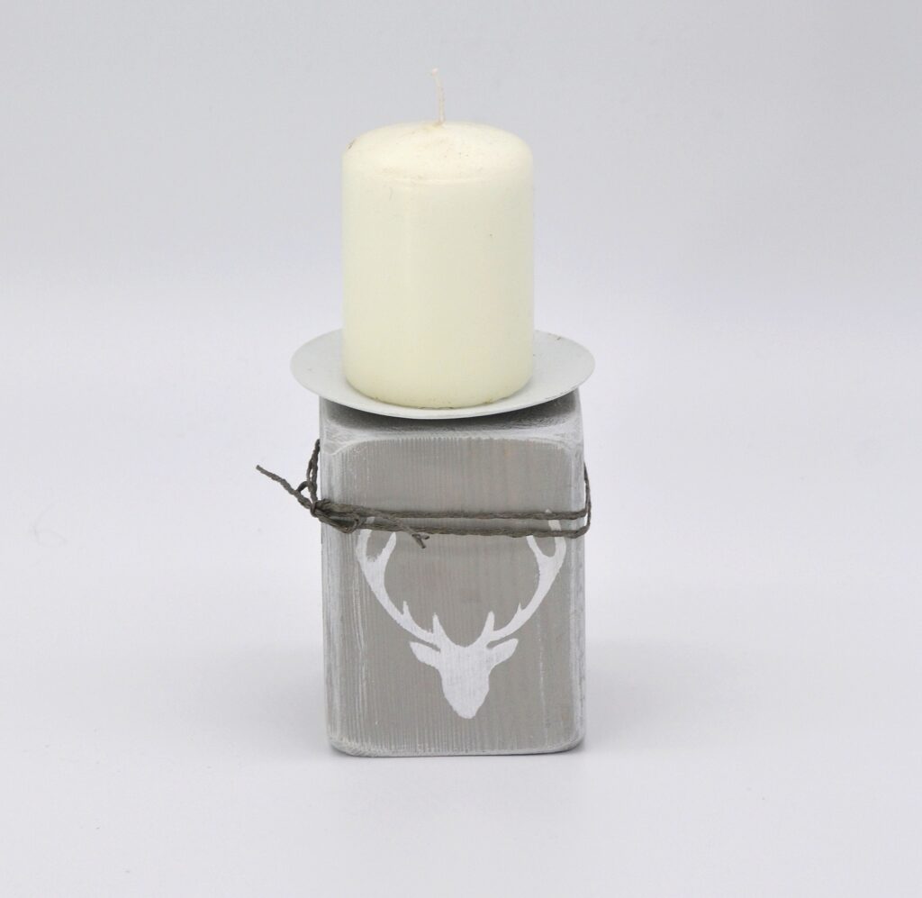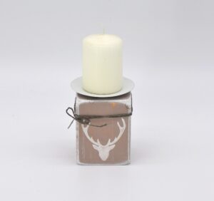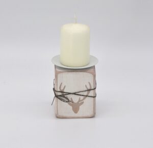 Kerzenhalter aus Holz/Hirsch in grau/weiß Material: Holz mit Metallhalterung für Stumpenkerzen Mit Liebe in Handarbeit hergestellt Größe: H11 B7,5 T7,5cm